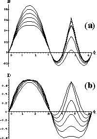 In the following, we explain how a temporal change in the phase distribution of the signal wave influences the reflectivity of the mirror. The phase conjugation process can be considered in analogy to real-time holography. A refractive index distribution (grating) is created by the interference of a signal wave and the fanout via the photorefractive effect. This distribution is equivalent to a hologram of the signal wave. The hologram is read out by the reflected fanout. As a condition for this process, the read out wave has to be phase conjugated with respect to the fanout. This is ensured by an self-organizing process during the onset period. However, if the spatial phase distribution of the signal wave changes, the interference pattern (signal wave and fanout) changes too. If this happens in a time period that is short with respect to the response time of the crystal, the refractive index grating remains nearly unchanged. The change of the phase distribution of the signal wave is communicated directly to the fanout and with that to the read out wave. Therefore, the phase distribution of the read out wave changes too. Consequently, the read out condition above-mentioned is no longer fulfilled for the changed parts of the read out wave. Therefore, the diffraction efficiency and with that the reflectivity of the SPPCM decreases. In this way, the change in a phase distribution is transformed into a reflectivity change and finally into a measurable intensity change. But, this simple model does not allow us to derive quantitative results. It is possible to derive an equation for the reflectivity decrease D, where D depends on the phase shift phi. This, on the other hand, offers the possibility to calculate the value of phi from a measured value of D. Thus, it is possible to realize a transient phase measuring technique.The graphs of the function D(phi) are shown in figure 1.