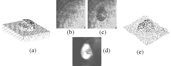 Figure (a) shows the given phase distribution (wavefront) in a 3D representation. The figures (b) and (c) show the two recorded intensity distributions, figure (d) shows the distribution of the calculated D and figure (e) that of the phi. The good correspondence of the figures (a) and (e) implicates that the described method can be practical for phase measurement. An advantage of this measuring technique in comparison with interferometric methods that use a phase shift procedure is, that the camera has to record one picture only during the measuring time. This is of weight especially if the process to be investigated is very fast. Another advantage in comparison with interferometric methods in general is that a reference arm (a separate light path that is not influenced by the phase object) is not needed. The measuring device is connected in series to the phase object to be measured. So the influence of vibrations of the arrangement etc. on the measuring process can be reduced.